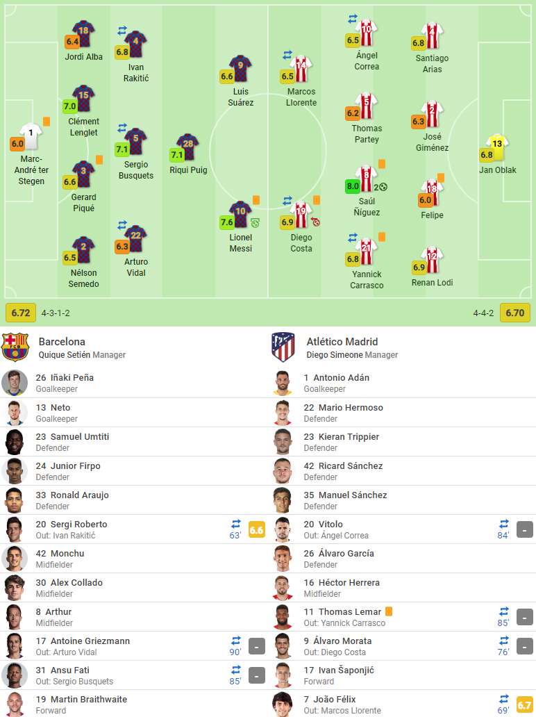 替补:26-伊尼亚基-佩尼亚、8-阿图尔、17-格列兹曼、19-布莱斯维特、20-罗贝托、23-乌姆蒂蒂、24-菲尔波、30-科利亚多、31-法蒂、42-蒙楚