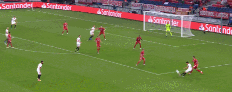 开场第11分钟,塞维利亚率先打破僵局!纳瓦斯右路传中,吕克-德容头球摆渡,拉基蒂奇中路插上在阿拉巴的干扰下倒地,主裁判判罚点球,奥坎波斯主罚一蹴而就!拜仁0-1塞维利亚!