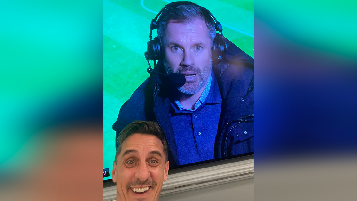 内维尔见状毫不犹豫地发动了反击。他和屏幕上呆滞的卡拉格来了个合影,尽管刚刚输完1-6,但内维尔欣喜之情溢于言表,已经笑开花了: