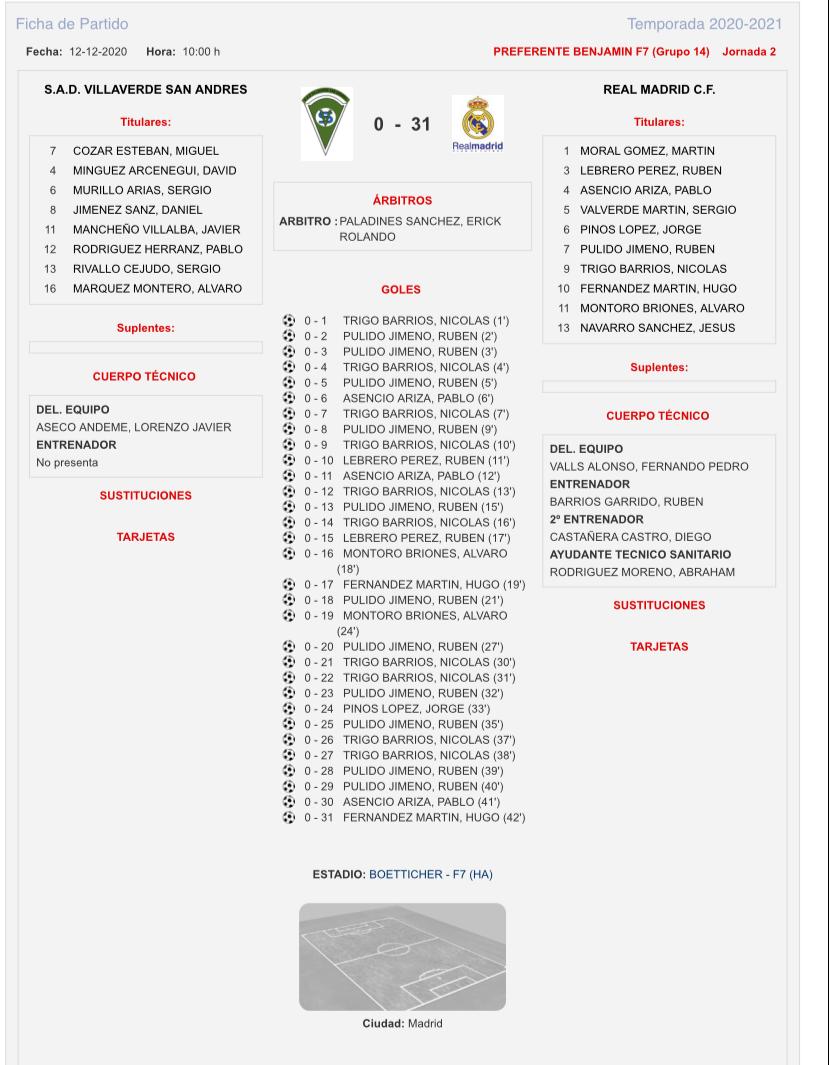 西班牙U9联赛第14组第2轮,皇马U9队做客比拉韦德U9,但却在别人的地盘31-0狂胜。其中9号小球员特里格-尼古拉斯进了10个球。