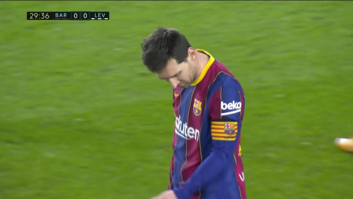 弗兰基-德容从中场位置带球一路突进杀入对方禁区,莱万特两名球员回追及时补位,德容没有射门空间的情况下选择回敲梅西,巴萨队长不停球直接选择抽射,谁料皮球竟被梅西踢出向外的弧线,随后出了边线。